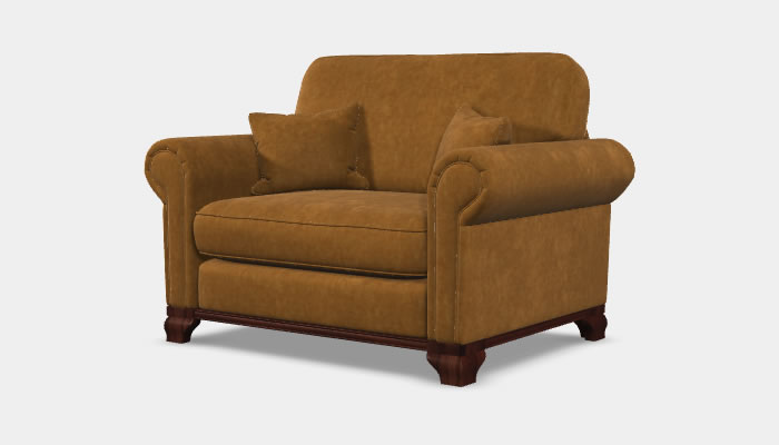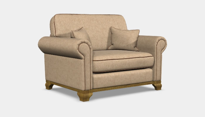 Wood Bros Lavenham Snuggler Love Seat The Wood Bros Lavenham love seat is a traditional style snuggler chair which features generous scroll arms and a wooden plinth. Available in an extensive range of beautiful fabrics, optional soft leather custom piping trim and legs in a selection of wood finishes.