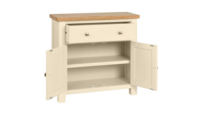 Digbeth Painted Compact Sideboard 1 Drawer 2 Doors This compact sideboard with 1 Drawer 2 Doors is perfect for smaller spaces where you need that extra bit of storage. Clean straight lines with stylish panels and dovetailed drawers crafted from white oak, pine and MDF. Available in Ivory, White and Moon Grey.